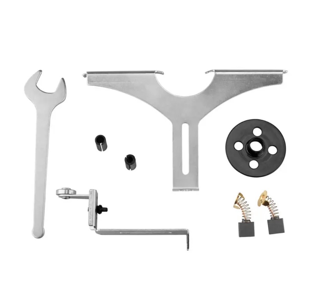 متعلقات اچار 24 میلیمتری -2 عدد کولت در سایزهای 6 و8- آچار-گونیا- نگهدارنده گونیا (ثابت روی دستگاه ) – راهنمای الگوی برش – راهنمای لبه گیری – ذغال